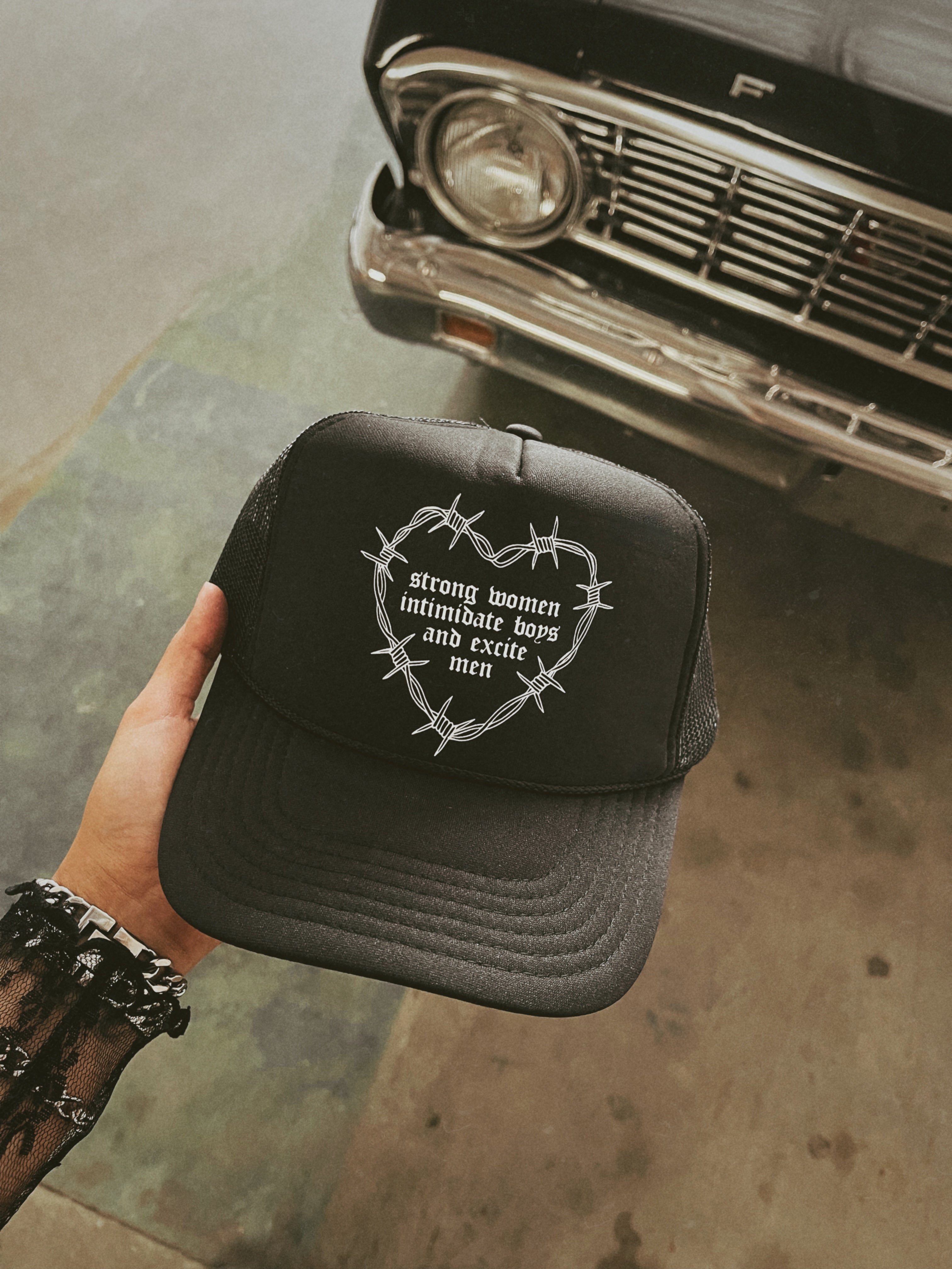 These are structured and high-profile foam trucker hats with "Strong Women Intimidate Boys And Excite Men" printed directly onto the front